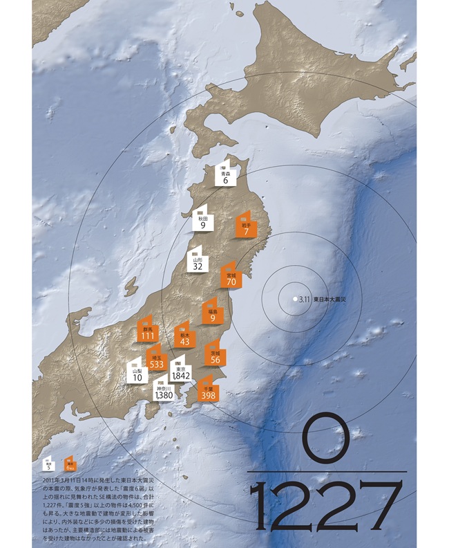 気象庁が発表した震度6弱以上の揺れに見舞われたSE構法の建物は、合計,1227棟。震度5強以上の建物は4,500棟。