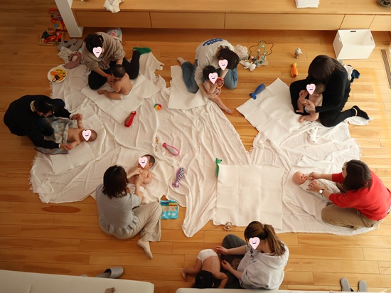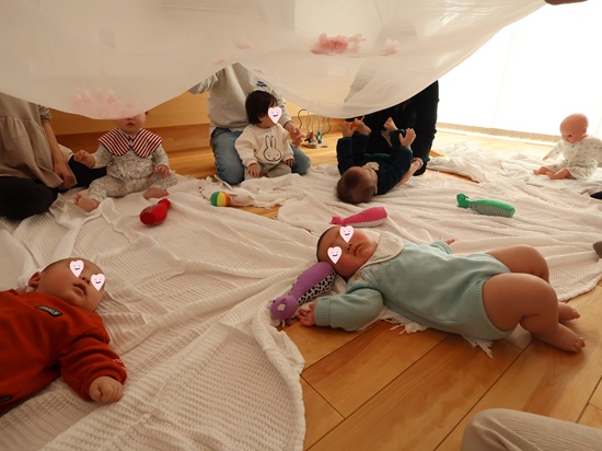 オイルを使ったベビーマッサージの他、布を使ってみんなで遊んだり、カフェタイムでおしゃべりを楽しんだり。