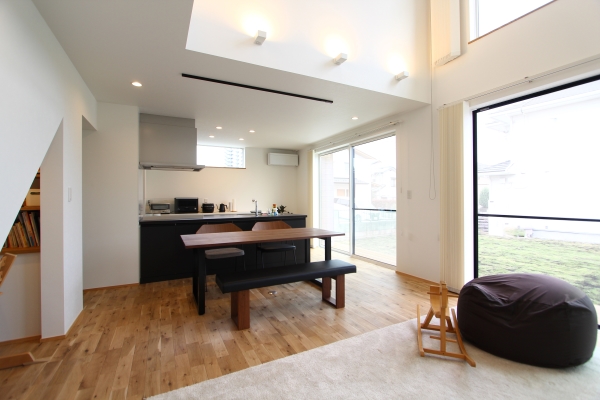 子世帯の住まいは、リビングに吹き抜けを取り入れ、家族の気配が感じながら開放感も楽しめる空間をご提案いたしました。