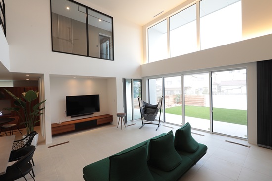 こちらのモダンインテリアの似合うお住まいは、一階のリビングだけでなく吹き抜けにも大開口があります。